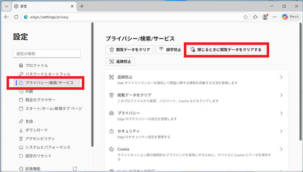 「プライバシー/検索/サービス」を選択し、「閉じるときに閲覧データをクリアする」をクリックします。