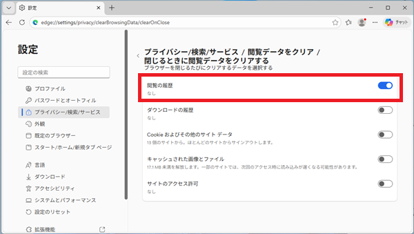 「閲覧の履歴」をオンにすると、Edge終了時に履歴が自動削除されます。必要に応じてキャッシュもオンにすると効果的です。