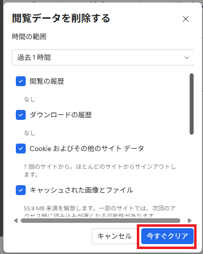 「閲覧の履歴」「ダウンロードの履歴」「オートフィルファームデータ(フォームやカードを含む)」にチェックし「今すぐクリア」をクリック