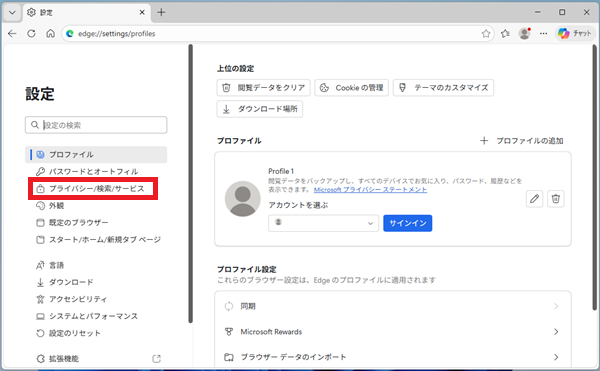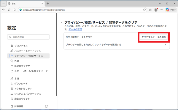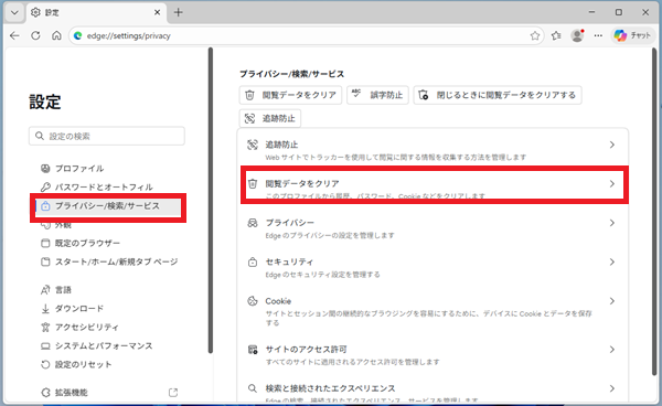 「プライバシー/検索/サービス」→「閲覧データをクリア」