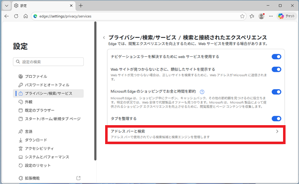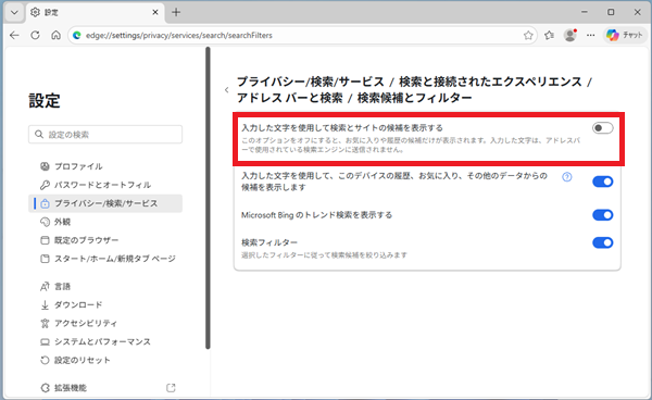 「入力した文字を使用して検索とサイトの候補を表示する」をオフにする