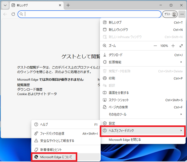 [ヘルプとフィードバック]→[Microsoft Edgeについて]を開く