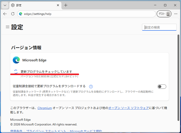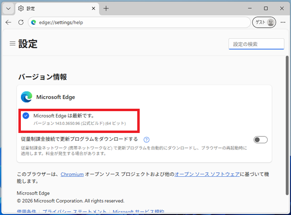 「Microsoft Edgeは最新です。」と表示されれば完了