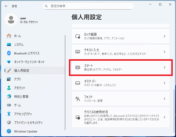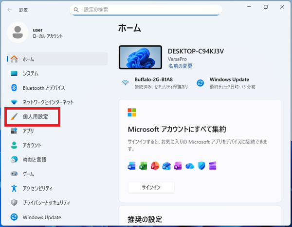 個人用設定」を選択。