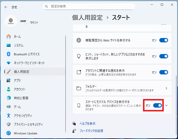 スタートにモバイルデバイスを表示する」のスイッチをオフにする。