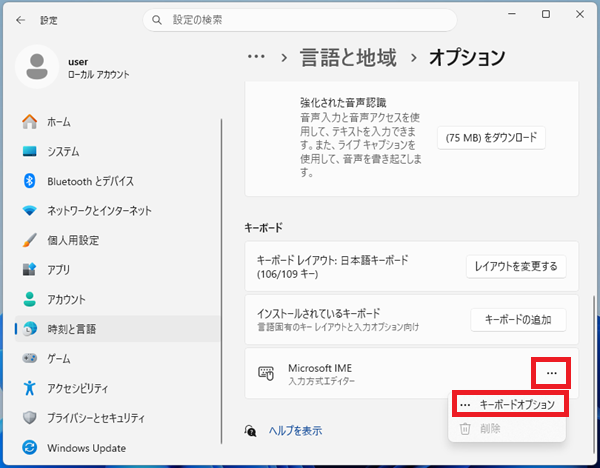 Microsoft IME の「…」をクリック→ キーボードオプション