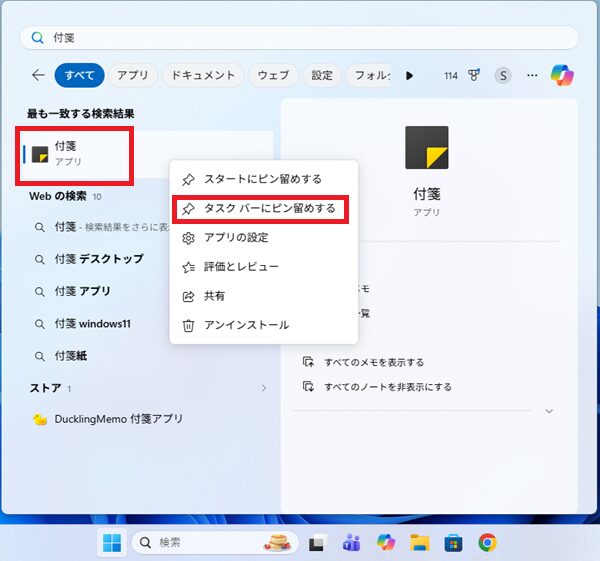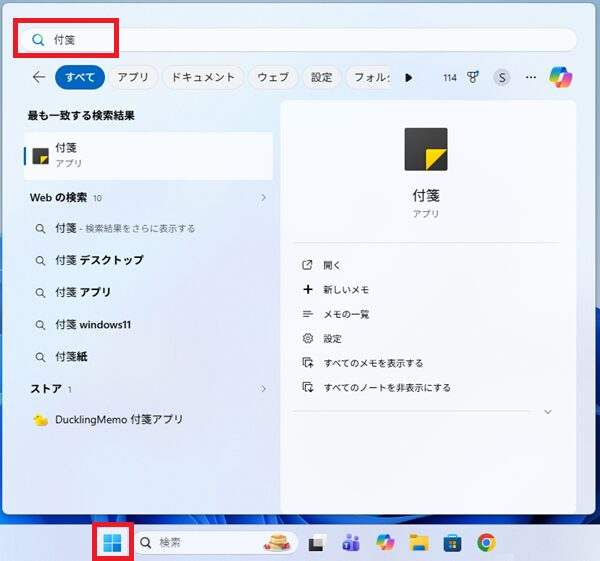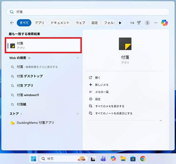 スタートメニュー をクリックし検索欄に 「付箋」 と入力