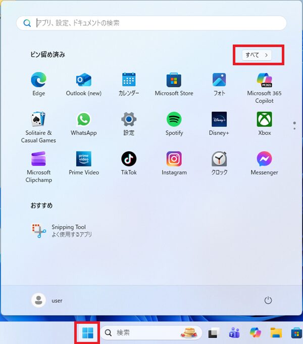 「スタートメニュー」 – 「すべて >」をクリック